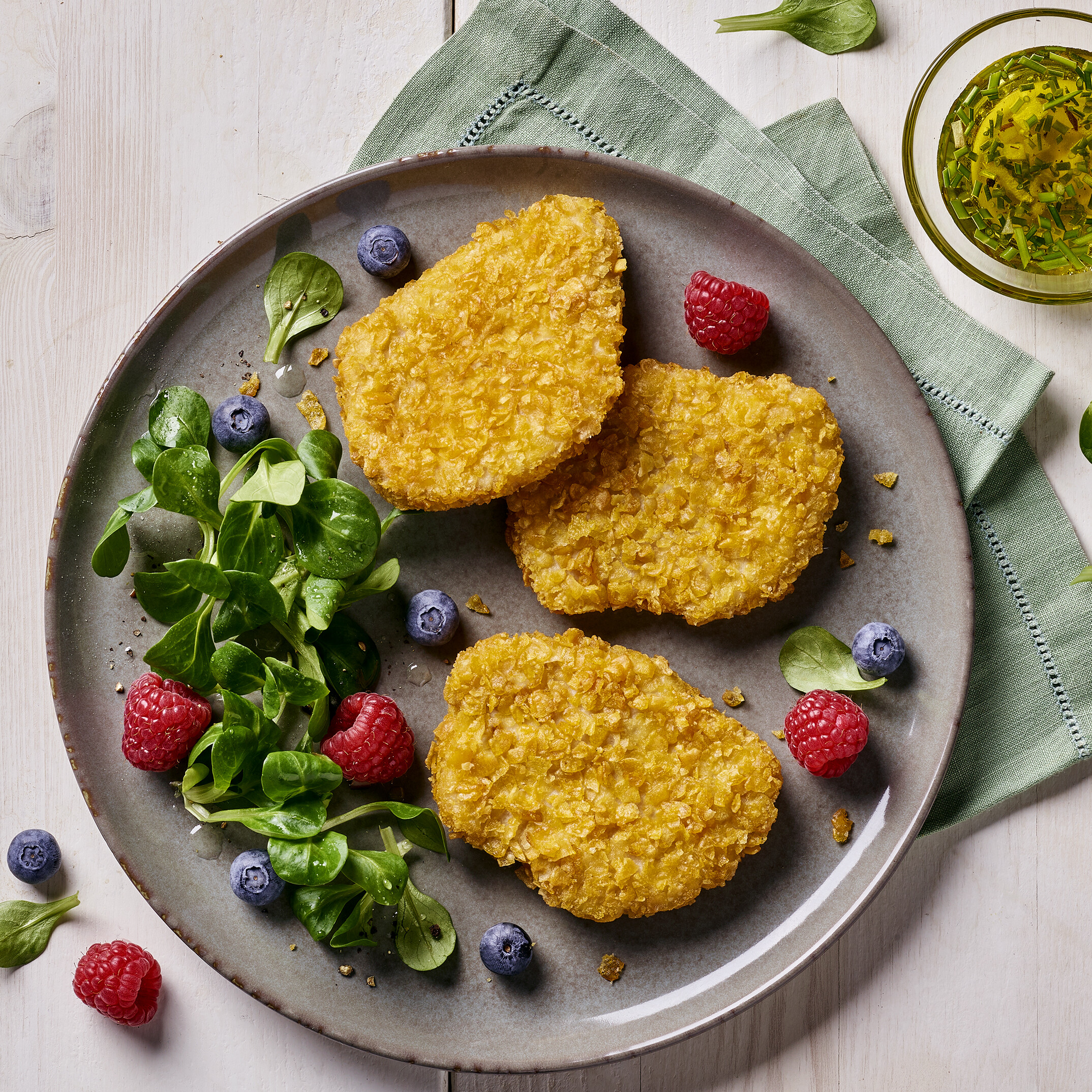 BIO Hähnchenfleisch fein zerkleinert und zusammengefügt, gewürzt, in einer knusprigen Panade, vorgebraten, einzeln entnehmbar, tiefgefroren