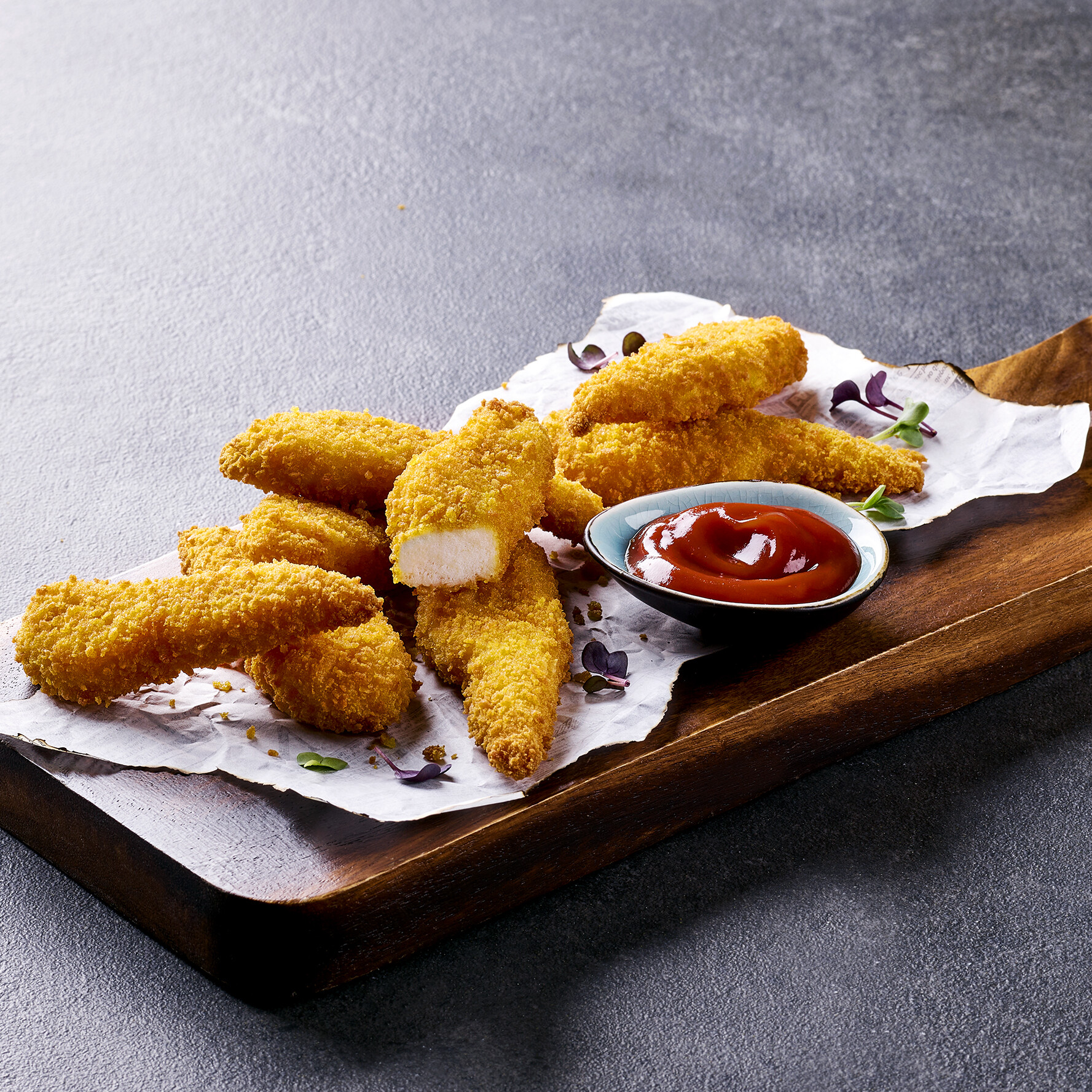 zartes Hähnchenbrustfilet, aus Fleischstücken zusammengefügt, flüssig gewürzt, in einer knusprigen Panade, vorgebraten, einzeln entnehmbar, tiefgefroren