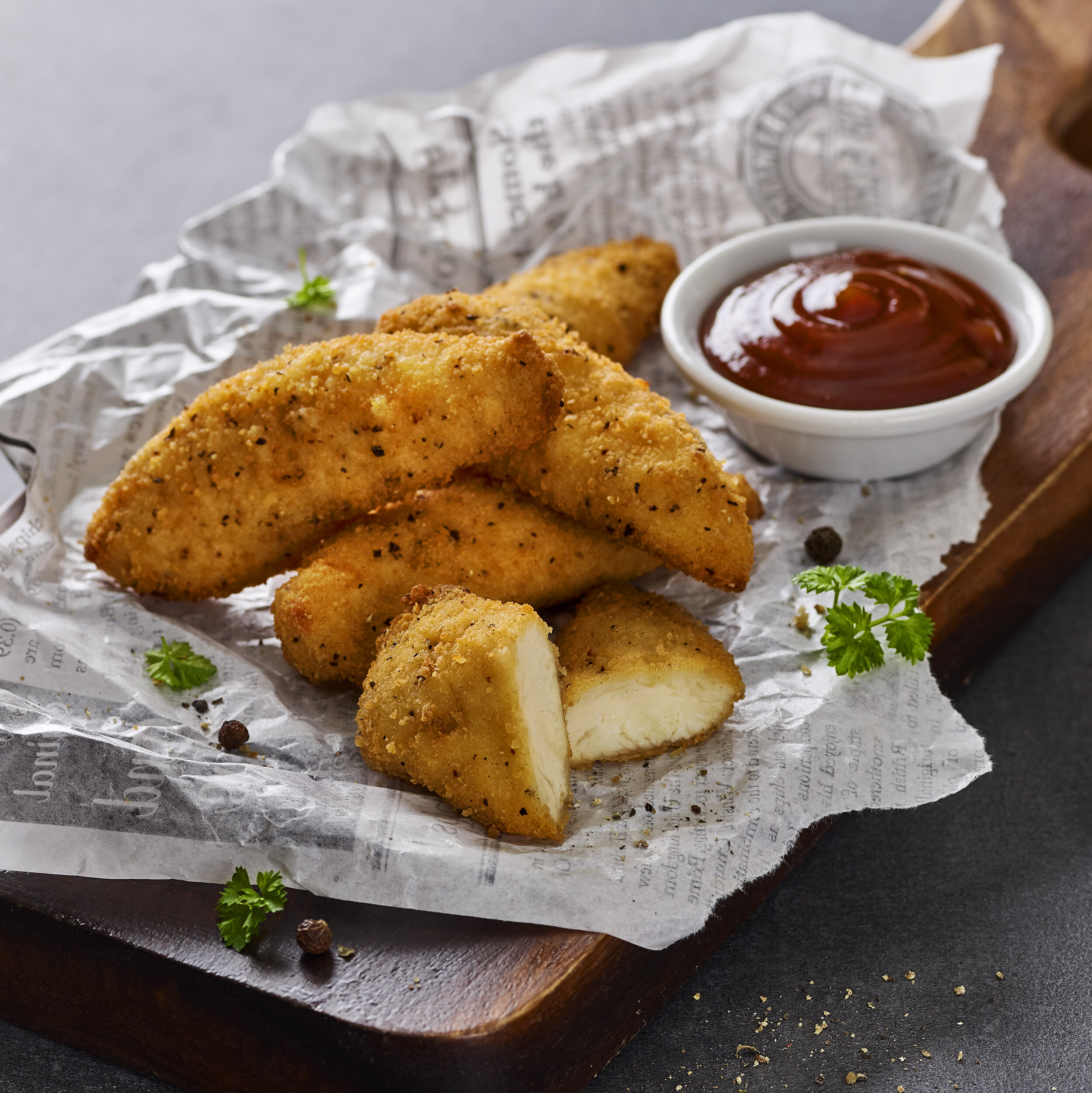 zartes Hähnchenbrustfilet, aus Fleischstücken zusammengefügt, flüssig gewürzt, in einer pfeffrigen Knusperpanade, vorgebraten, einzeln entnehmbar, tiefgefroren