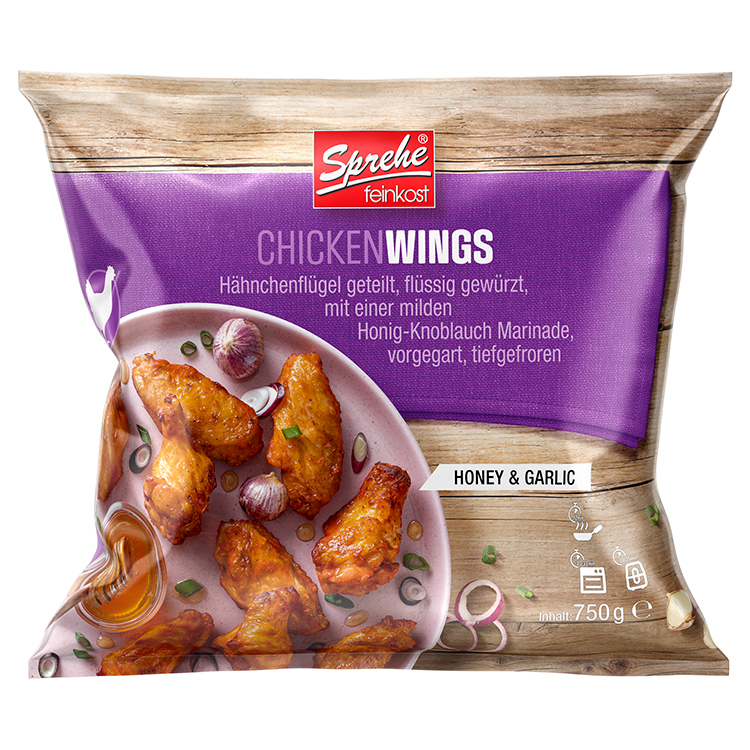 Hähnchenflügel, geteilt, flüssig gewürzt, mariniert mit Honig und Knoblauch, vorgegart, einzeln entnehmbar, tiefgefroren