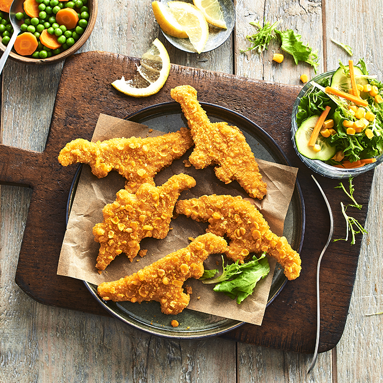 Aus fein zerkleinertem Hähnchenbrustfleisch geformt, flüssig gewürzt, in Cornflakes-Panade, vorgebraten, einzeln entnehmbar, tiefgefroren