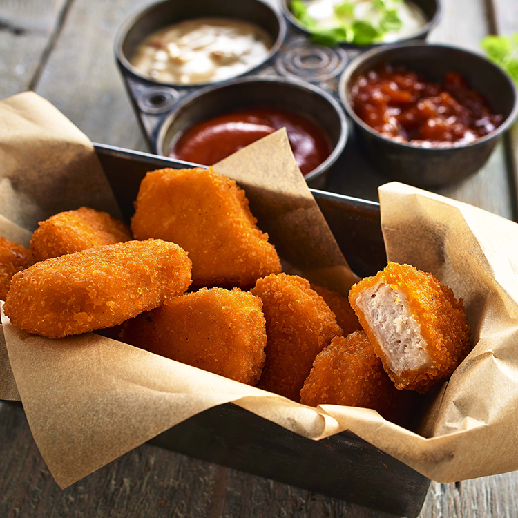 Aus fein zerkleinertem Hähnchenfleisch geformt, flüssig gewürzt, mit einer knusprigen Panade, vorgebraten, einzeln entnehmbar, tiefgefroren