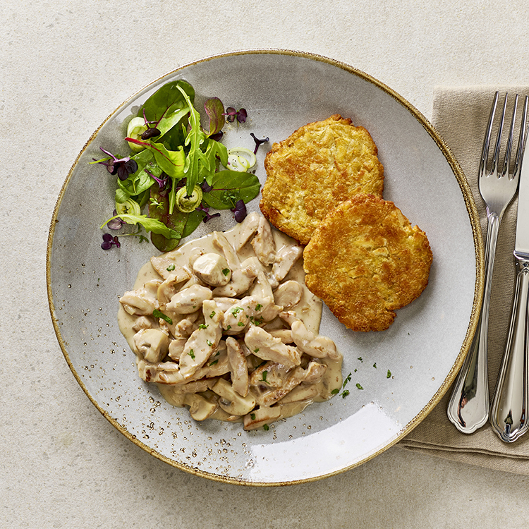 Hähnchengeschnetzeltes aus der Keule, flüssig gewürzt, vorgebraten, in Streifen geschnitten, einzeln entnehmbar, tiefgefroren