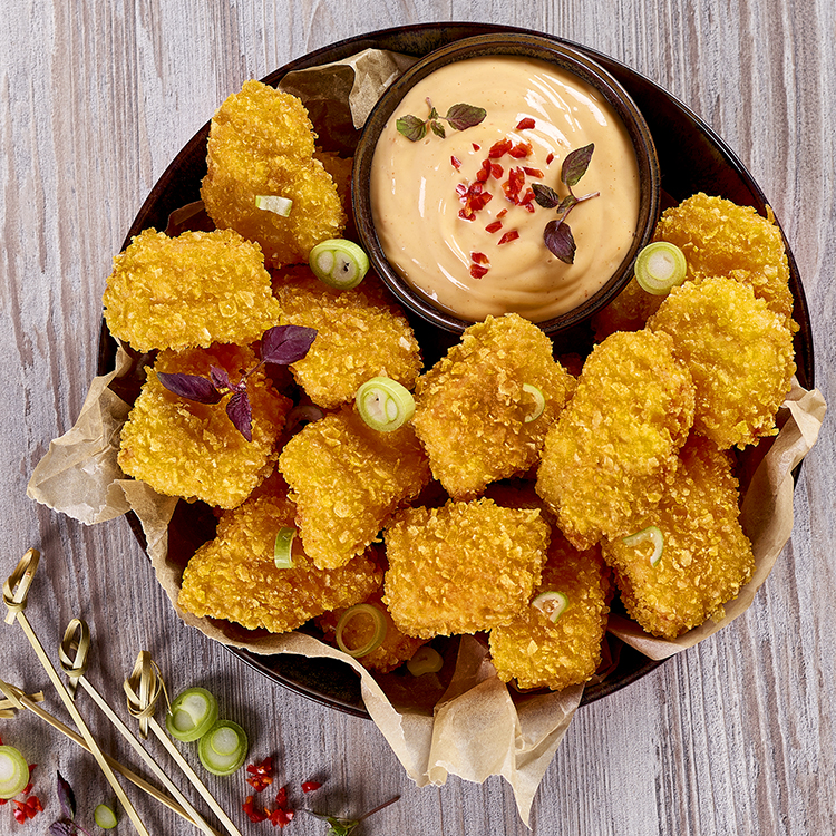 Geschnitten aus dem Hähnchenbrustfilet, mit 8% Flüssigwürzung, in Cornflakespanade, einzeln entnehmbar, tiefgefroren