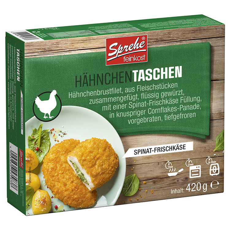 zartes Hähnchenbrustfilet, aus Fleischstücken zusammengefügt, flüssig gewürzt, mit einer Spinat-Frischkäse Füllung, in knuspriger Cornflakes-Panade, vorgebraten, tiefgefroren