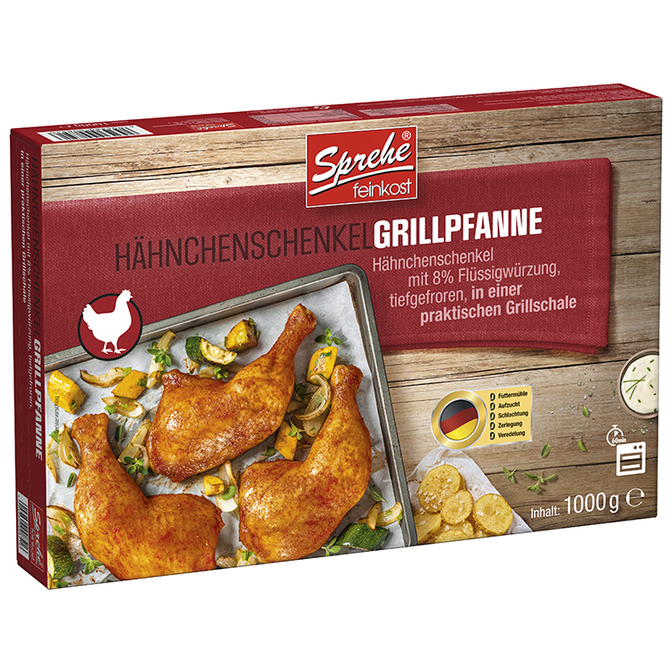 Hähnchenschenkel, mit 8 % Flüssigwürzung, in einer praktischen Grillschale, tiefgefroren