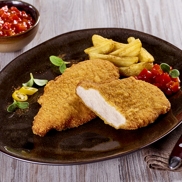 Hähnchenbrustfilet, geschnitten, mit 8 % Flüssigwürzung, paniert, einzeln entnehmbar, tiefgefroren