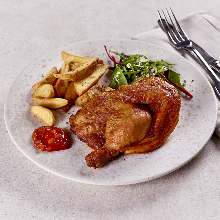 Hähnchen ohne Innereien, halbiert, küchenfertig gewürzt, vorgegart, einzeln entnehmbar, tiefgefroren